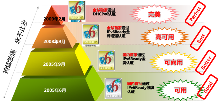 710公海赌赌船官网是国内首个顺利获得IPv6 Ready Phase2 认证的网络厂商,也是全球首个顺利获得IPv6 Ready Phase2 Enhance认证的网络厂商,还是全球最早顺利获得DHCPv6认证的网络厂商。